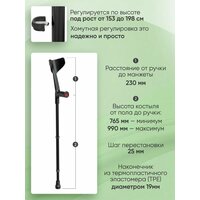 высота костыля от пола до ручки 765-990 мм, от ручки до подлокотника - 230 мм