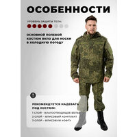 Костюм демисезонный вкбо (5 уровень), ткань мембрана. Основной полевой костюм вкбо для холодной погоды. Куртка свободного анатомического кроя с липучками для шевронов, знаков отличия. Не сковывает движения. Застегивается на молнию, карманы врезные, нагрудные, на молнии. Рукав прямой, на манжете-резинке, регулируется липучкой. На плечах фальш погоны. Капюшон несъемный, регулируемый по объему. Брюки прямые, со шлевками, с накладными и боковыми карманами. В комплекте эластичные, регулируемые подтяжки. Костюм камуфляжный обладает водоотталкивающими, ветрозащитными свойствами, защищает в непогоду. Быстро сохнет. Мембранная ткань способствует воздухообмену, обладает высокой паропроницаемостью при нагрузках. Легкий и компактный, эластичный. Регулировка посадки по фигуре.