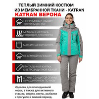 Сфера использования: Туризм, прогулки, горные лыжи, рыбалка; Анатомический крой; Температурный режим до -35(температура экстрима), до -20 (комфорт); Мембрана 10000/10000; Ткань Taslan; Утеплитель Isosoft; Подклад Искусственный шелк, флис (воротник); Двойная ветрозащитная планка; Утяжка по капюшону; Утяжка по низу рукавов; Светоотражающие элементы; Карман на рукаве под skipass; Внутренний карман; Ветрозащитная юбка внутри куртки; Отстегивающаяся спинка брюк; Женский зимний Костюм Katran Верона лучшим образом сочетает в себе функциональные свойства и стильный внешний вид, что позволяет ему быть востребованным как на склоне, так и в прогулках по городу в ненастную погоду. Куртка и брюки с синтетическим утеплителем Isosoft сшиты из мембранной ткани и не сковывают движений. Мембрана с высоким показателем 10000/10000 защищает от промокания и вентилируется. Данный утеплитель позволит вам находится долгое время на холоде до -35(температура экстрима), до -20 (комфорт).