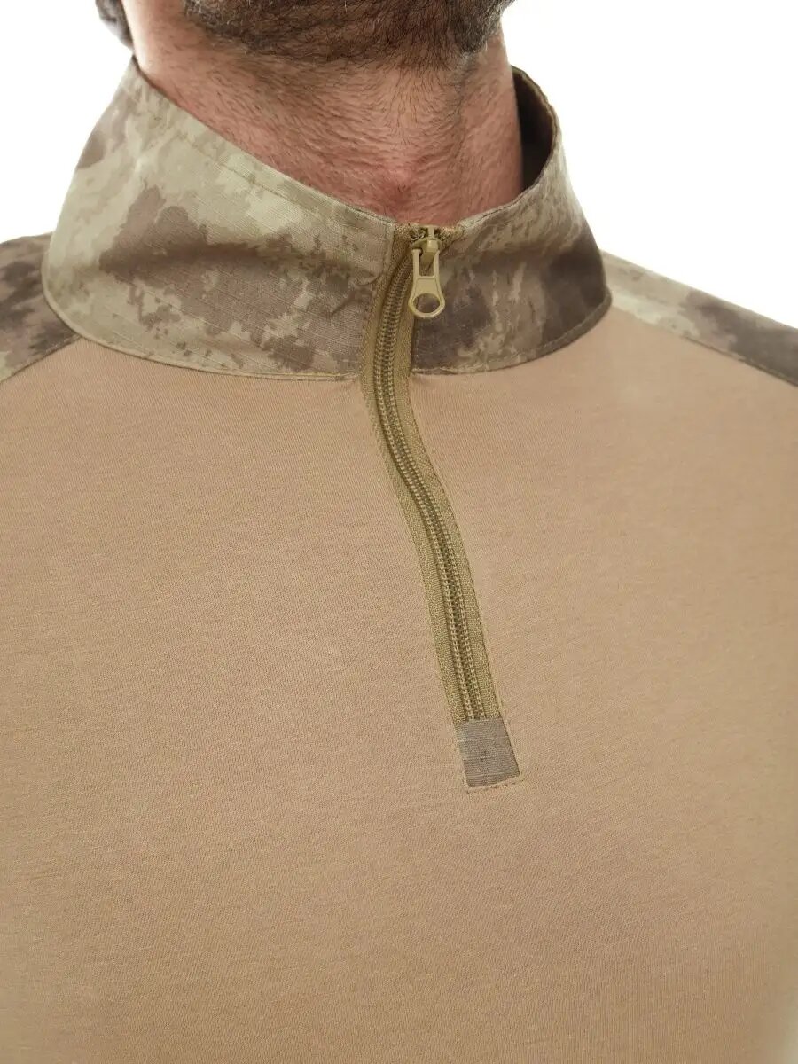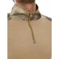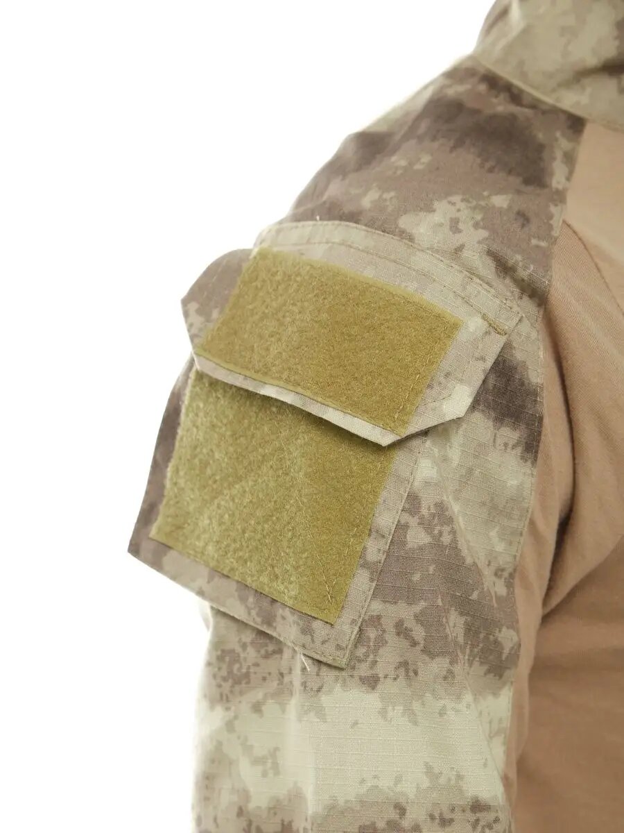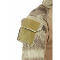 Боевая рубашка с высоким воротом на молнии и двумя карманами на липучке на плечах. На карманах велкро под шевроны. На рукавах манжеты на липучке.