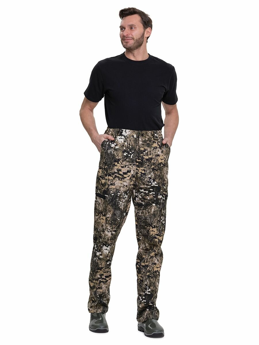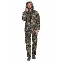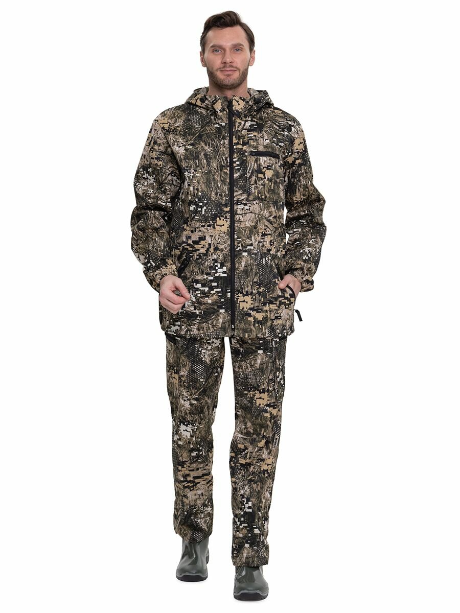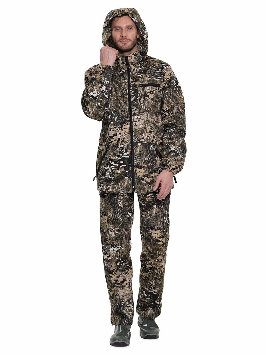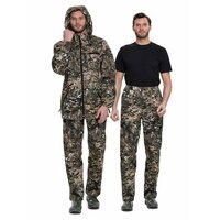 Куртка: прямого силуэта с притачным капюшоном, с центральной застёжкой на молнию. Защиту от насекомых и дополнительный комфорт обеспечат эластичный шнур по низу куртки, а на рукавах – эластичная лента. Капюшон: притачной, объём регулируется по лицевому вырезу шнуром, глубина регулируется в затылочной части хлястиком на полукольцах. Брюки: прямого силуэта, с застёжкой на молнию, с притачным поясом со шлёвками. Плотность прилегания к талии регулируется поясом с резинкой по бокам. По низу брюк эластичный шнур с фиксаторами. Карманы. Куртка: 1 нагрудный объёмный накладной карман на молнии; нижние накладные карманы с наклонной линией входа с застёжкой на молнию. Брюки: боковые карманы; выше линии колена боковые объёмные накладные карманы на молнии.