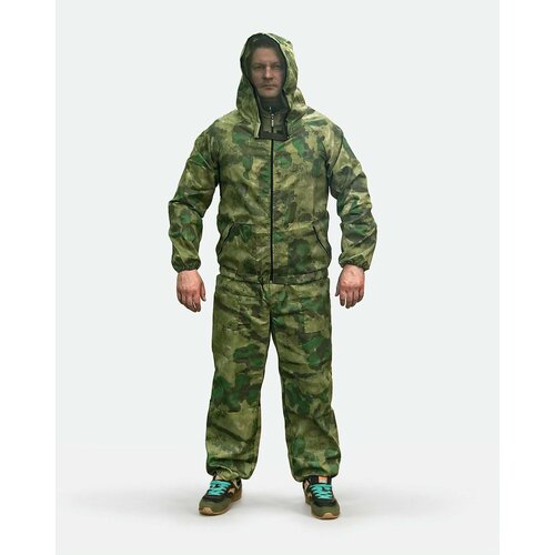 Костюм "Зарница" сшит из сорочечной ткани (80% полиэстер 20%хлопок) Ткань не мнется, не дает усадку при стирке. Костюм состоит из куртки и брюк. Куртка прямого силуэта, низ спинки присобран эластичной тесьмой(резинкой). Спереди 2 больших накладных кармана, застегивается куртка на молнию. Рукав рубашечного кроя, низ рукава присобран эластичной тесьмой. По краю капюшона отстегивающаяся москитная сетка. Брюки на поясе и внизу брючин присобраны эластичной тесьмой. В пояс вставлен шнур с фиксатором, есть шлевки под ремень. На брюках есть 2 больших накладных кармана.