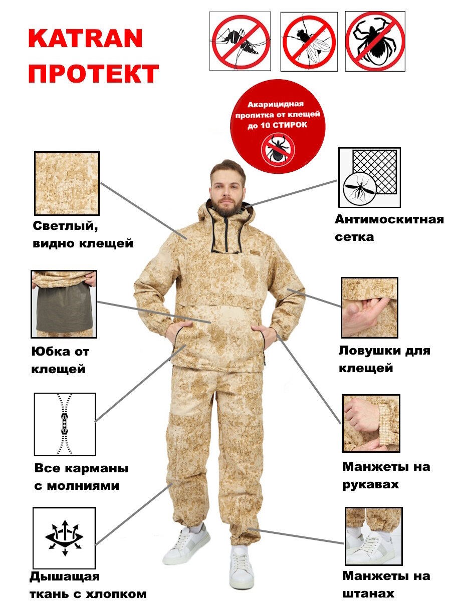 Купить Костюм мужской противоэнцефалитный антимоскитный против клещей KATRAN Протект (Твил, песок КМФ), Размер: 52-54 Рост: 170-176 с доставкой по всей России.