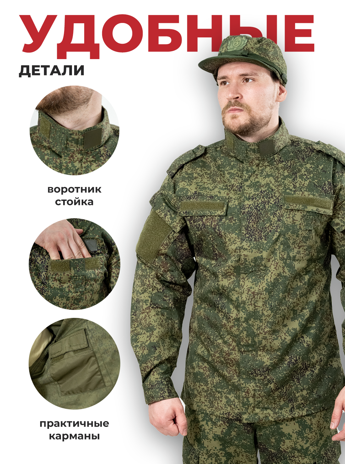 Военный китель оснащен воротником-стойкой. Застежка на молнии закрывается непродуваемой планкой на липучках. На груди и рукавах есть по два кармашка, сверху закрытых клапанами. Предусмотрены 6 велкро для нашивок.