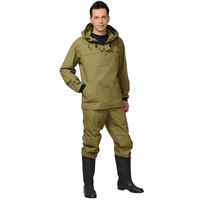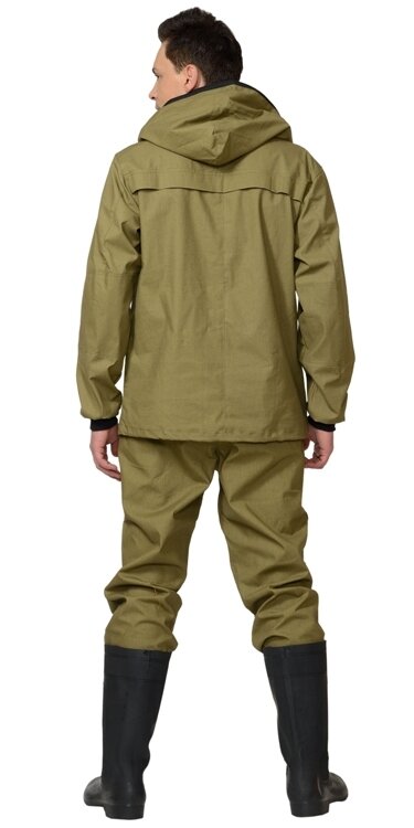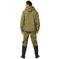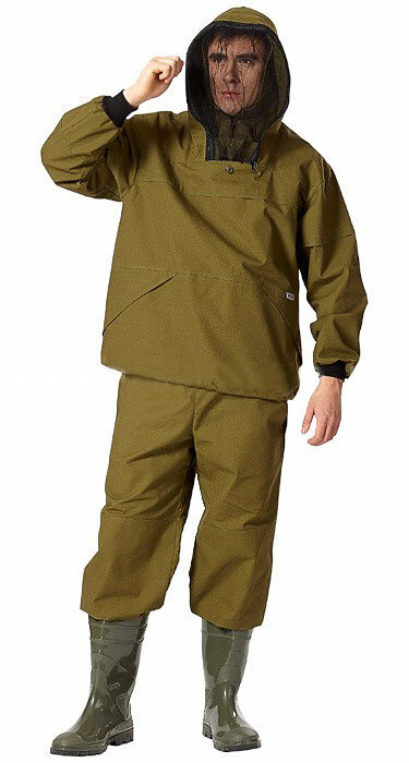 Костюм состоит из куртки и брюк цвета хаки. Куртка оснащена капюшоном с сеткой, налокотниками и наколенниками, что обеспечивает дополнительную защиту от насекомых и грязи. Низ куртки оснащен шнуром для регулировки размера, а манжеты рукавов и низа брюк выполнены из трикотажа для дополнительного комфорта.