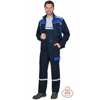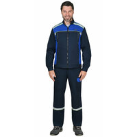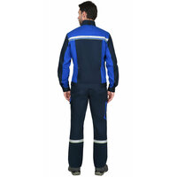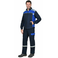 Костюм "Практик-Люкс-Росс" представляет собой комплект из куртки и полукомбинезона, предназначенный для использования в летний период. Костюм выполнен в темно-синем цвете с васильковыми элементами, что делает его стильным и практичным.