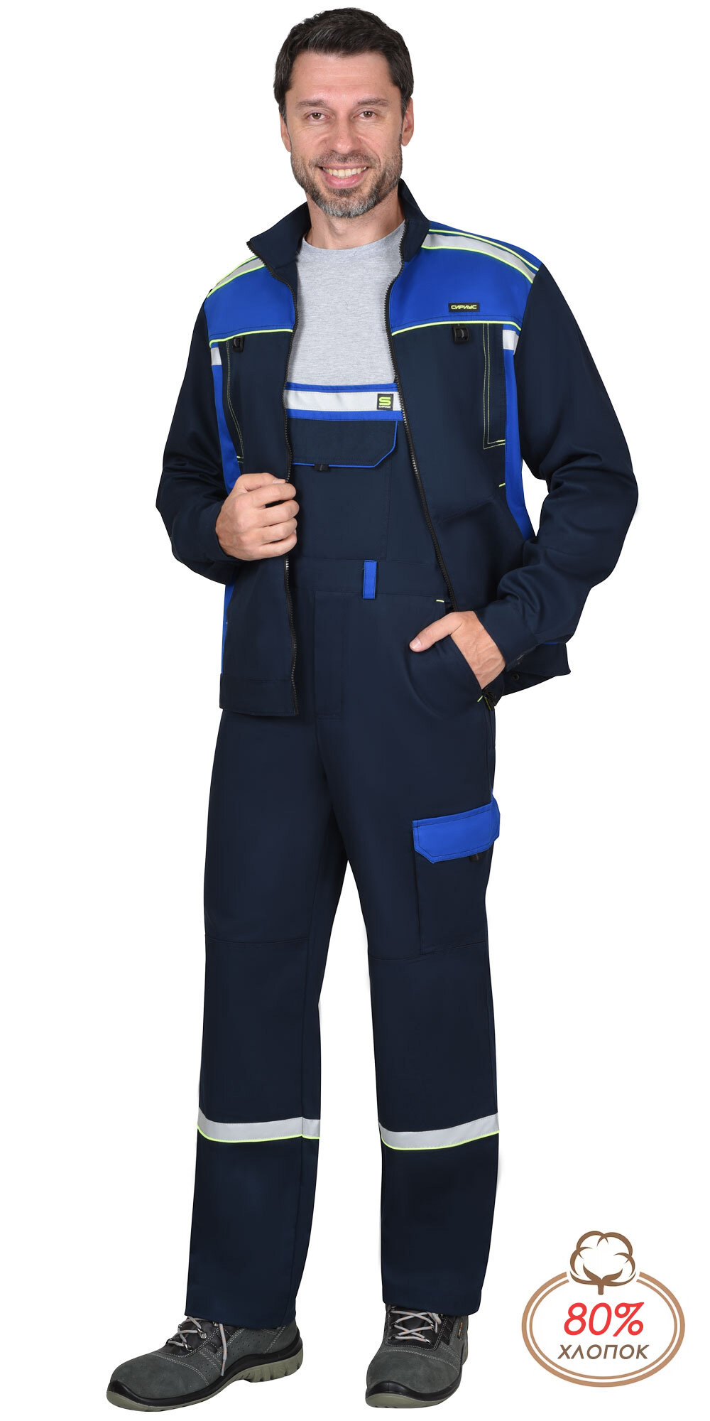 Полукомбинезон костюма оснащен застежкой гульфика и застежкой в правом боковом шве, а также карманами на груди и спине. Наколенники и карманы для инструментов обеспечивают дополнительную защиту и удобство при работе.