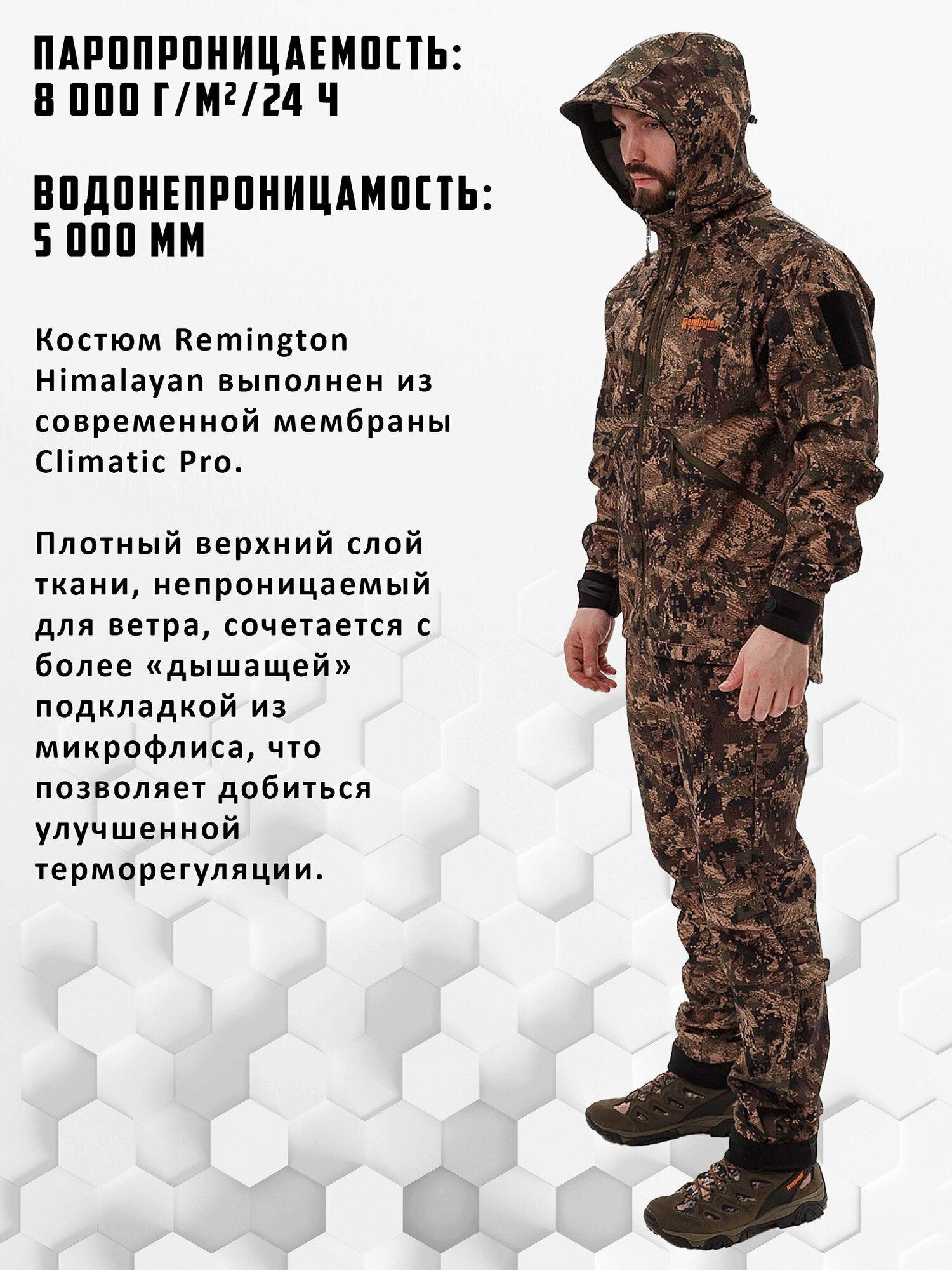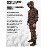 Костюм Remington Himalayan выполнен из современной мембраны Climatic Pro с характеристиками Паропроницаемость 8 000 г/м²/24 ч, Водонепроницамость 5 000 мм. Плотный верхний слой ткани, непроницаемый для ветра, сочетается с более «дышащей» подкладкой из микрофлиса, что позволяет добиться улучшенной терморегуляции. Для дополнительной вентиляции в костюме предусмотрены молнии в области подмышек. Для комфортного использования в костюме предусмотрены множественные регулировки объема, позволяющие обеспечить наилучшую посадку и защитить от попадания холодного воздуха. Высокий воротник стойка с втачным капюшоном дополнительно защитит от непогоды и позволит сохранить тепло. Множество карманов различного объема позволят правильно распределить и сохранить все личные вещи.