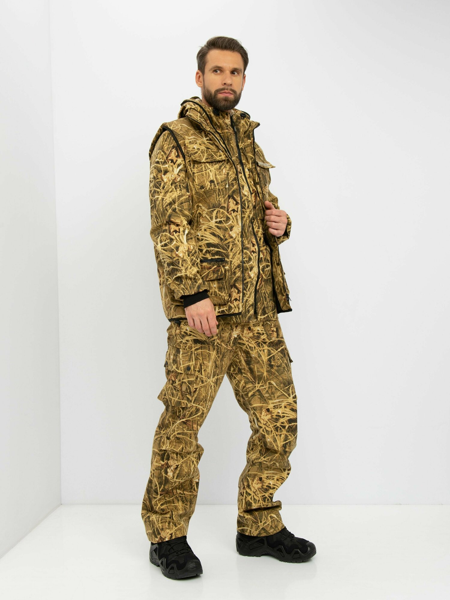 Костюм тактический мужской летний Huntsman Тайга-3 из смесовой ткани цвета Камыш предназначен для приверженцев активного отдыха. Любителям рыбалки, охоты, туризма такая амуниция пригодится и в лесу, и на берегу водоема. Отдых в лесу, игра в пейнтбол, страйкбол, катание на квадроциклах, туристический поход в лес - этот защитный комплект в любой ситуации будет оптимальным вариантом. Данная модель походной одежды представляет собой практичный костюм-тройку для туризма и отдыха: куртка, штаны, жилетка. Такой камуфляжный костюм для леса будет хорош и как амуниция рыбака, и как спецодежда или форма охранника. Он станет отличным подарком мужчине, который ведет спортивный и подвижный образ жизни. Маскировочный комплект годится для похода, в лес, на природу, на дачу. Такой костюм рыболовный мужской можно покупать в подарок рыбаку. Плотность смесовой такни, из которой изготовлены брюки и куртка, составляет 220 г/кв. м. В такой одежде боевой настрой гарантирован и в рыболовный, и в охотничий и в туристический сезон. Особенности модели: подкладка; притачной капюшон; объёмные карманы на груди; боковые карманы; эластичные манжеты из рибаны; брюки с застёжкой гульфика на пуговицы; жилет на молнии с воротником «стойка»; дополнительный объем брючин в области колена; два накладных кармана на брюках; на жилете один внутренний карман, два нагрудных, два боковых, два кармана внизу на замке. Всего в костюме 17 карманов, поэтому данный комплект можно назвать разгрузочным костюмом. Жилет утеплен материалом Radotex плотностью 150 г/кв. м.