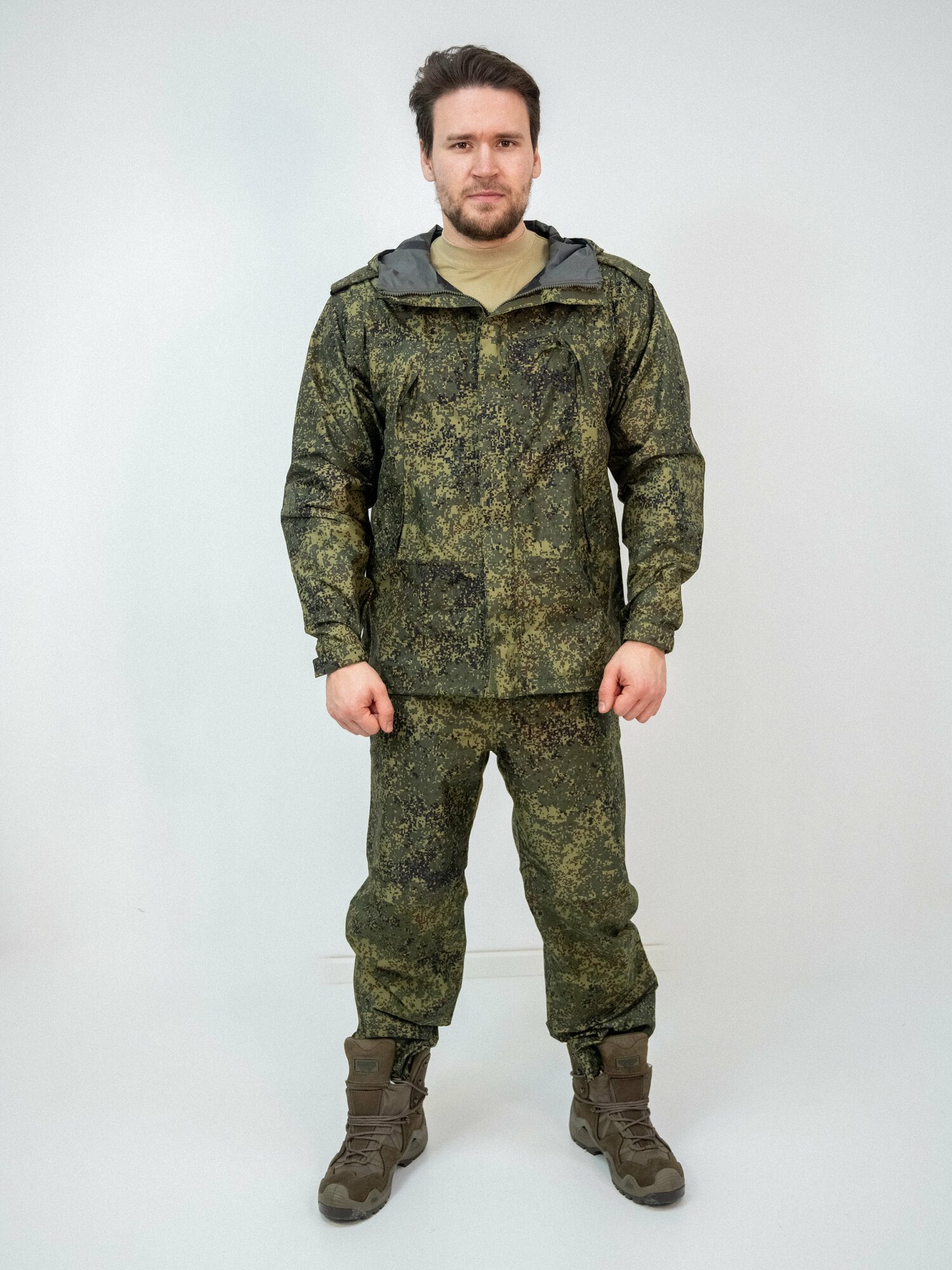 Костюм уставной ВВЗ ветроводозащитный вкбо / вкпо. В комплект входят куртка с капюшоном и брюки. Куртка свободного пошива, носится на выпуск. Изделие оснащено вшитым капюшоном, центральной застежкой на двухзамковую молнию, которая закрыта двойным клапаном, защищающим от холодного ветра. Все молнии – водостойкие, что обеспечивает дополнительную защиту в проливной дождь. В области локтей имеются накладки из высокопрочной ткани, что обеспечивает износостойкость в легко истираемых местах. На груди куртки имеются молнии, расстегнув которые можно обеспечить поступление воздуха под одежду. Также данные вентиляционные отверстия обеспечивают свободный доступ к внутреннему слою одежды. Капюшон, а также низ куртки регулируются резинками с фиксаторами. Манжеты регулировать по запястью с помощью паты. Брюки удобные, носятся на выпуск поверх берц. Застегиваются на молнию и кнопку. Пояс регулируется эластичным шнуром и фиксатором. Низ брюк регулируется по ноге с помощью паты. Истираемые места (область коленей и сидения) усилены высокопрочными накладками из ткани Cordura 350D, что обеспечивает длительную эксплуатацию брюк. По боковым швам брюк вшиты молнии для легкого доступа к нижней одежде. Также благодаря молниям можно быстро переодеться, не снимая ботинок, или оказать медицинскую помощь в случае ранения ноги. Все швы и молнии куртки и брюк проклеены, что отлично защищает от дождя и ветра, сохраняя сухое тепло под одеждой.