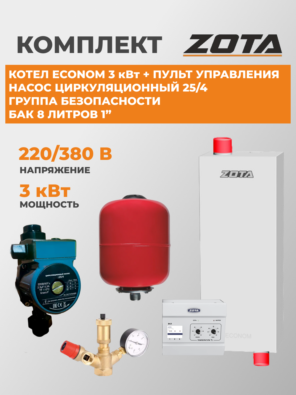 Котел электрический ZOTA Econom 3, комплект, насос 25/4, группа безопасности, бак 8 литров: сравнение цен, характеристики, фото, актуальное наличие и цены.