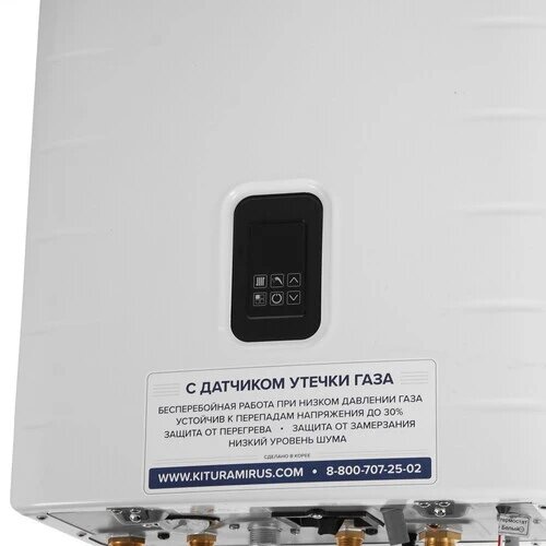 Двухконтурный котел со встроенным датчиком утечки газа, двухуровневым теплообменником из нержавеющей стали и встроенным пультом управления. Теплообменник ГВС из нержавеющей стали.