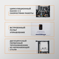 | Особенности | воздухоотводчик, встроенный расширительный бак, встроенный циркуляционный насос, манометр, предохранительный клапан, разъем для подключения внешнего управления, термометр |