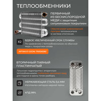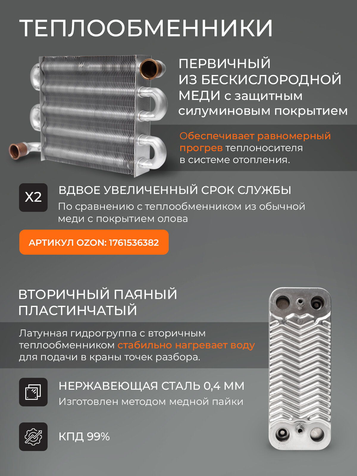 Котел укомплектован для работы на природном газе, для работы на сжиженном газе необходимо приобрести комплект из 12 форсунок. Двухконтурный котел имеет внутри первичный медный теплообменник с силуминовым покрытием для передачи тепла от сгорающего газа к теплоносителю и вторичный пластинчатый теплообменник из нержавеющей стали, за счет которого котел может быть подсоединен одновременно к системе отопления и в точки потребления горячей воды. При необходимости котел можно использовать только для контура отопления без подключения контура горячей воды.