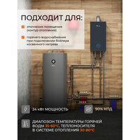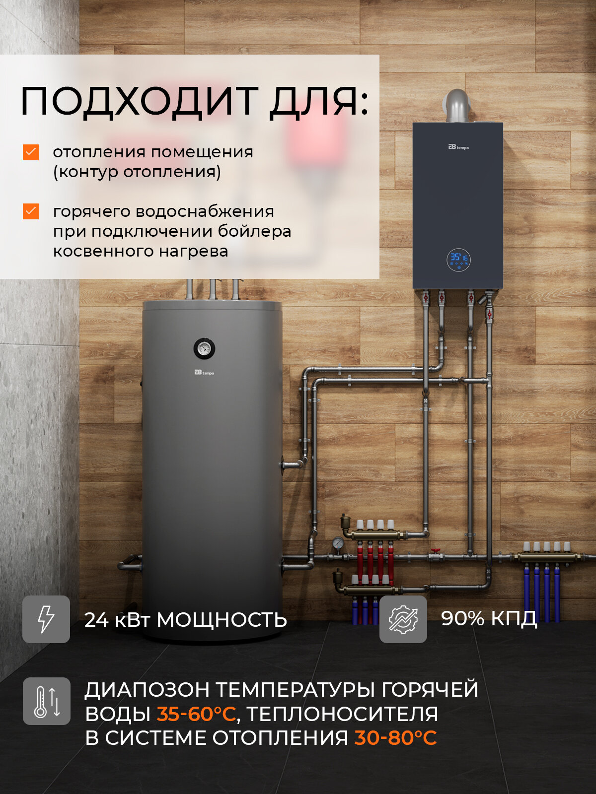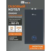 Котел под брендом E8 tempo марки GHA24V - это интерьерный газовый котел со стеклянной панелью в сером цвете. Газовый котел имеет мощность 24 кВт и предназначен для обогрева жилого дома площадью от 60 до 240 квадратных метров и для получения горячей воды от бойлера косвенного нагрева, который приобретается отдельно и работает в паре с данным котлом.