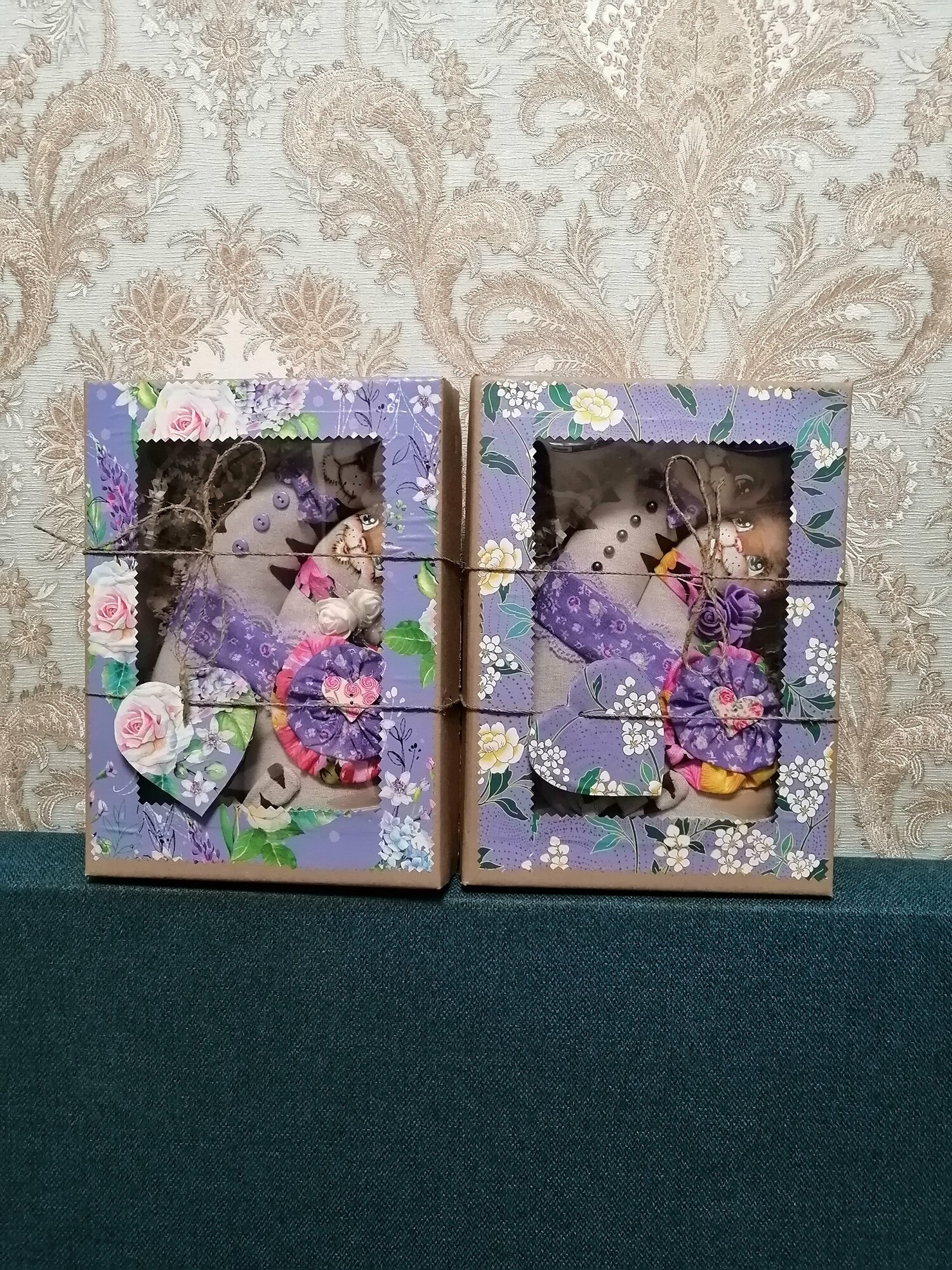 Пара неразлучников кот и кошечка из льна, наполнитель - холлофайбер. Расписаны акриловыми и масляными красками. Для украшения использованы ситец, кружево, бусины, деревянный декор, цветы искусственные. Ручная работа, поэтому котики могут немного отличаться. Обязательно повторяется цвет волос и расцветка основного ситца в декоре. Вариант оформления коробки может отличаться.