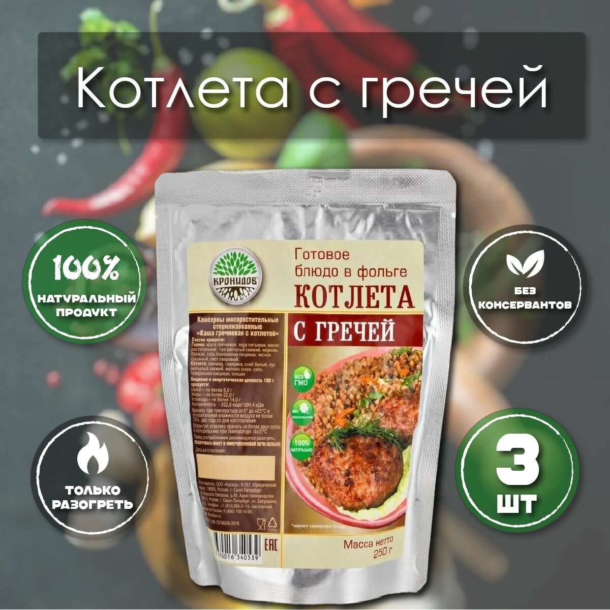 Купить Котлета с гречей «Кронидов» 250 г, 3 упаковки, готовая еда в упаковке с доставкой по всей России.
