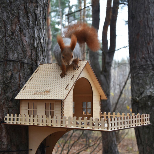 Это качественная и прочная кормушка для белок и птиц, которая станет отличным украшением вашего двора или парка. Кормушка выполнена из качественной березовой фанеры, её конструкция обеспечивает долговечность и надежность (при условии покрытия кормушки лаком).