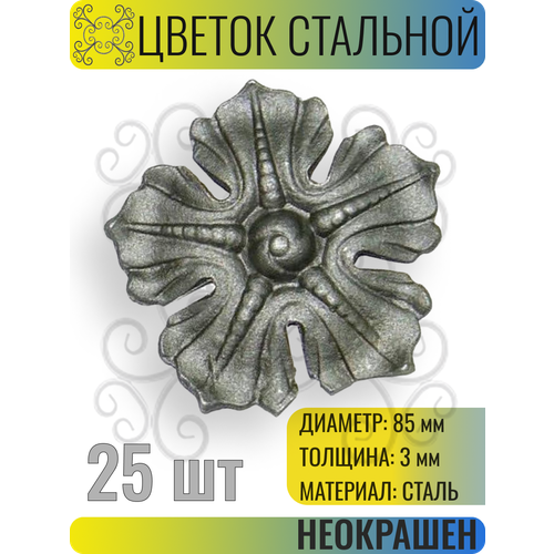 Кованый элемент Цветок стальной. Диаметр 85 мм Толщина 3 мм — 25 шт: сравнение цен, характеристики, фото, актуальное наличие и цены.