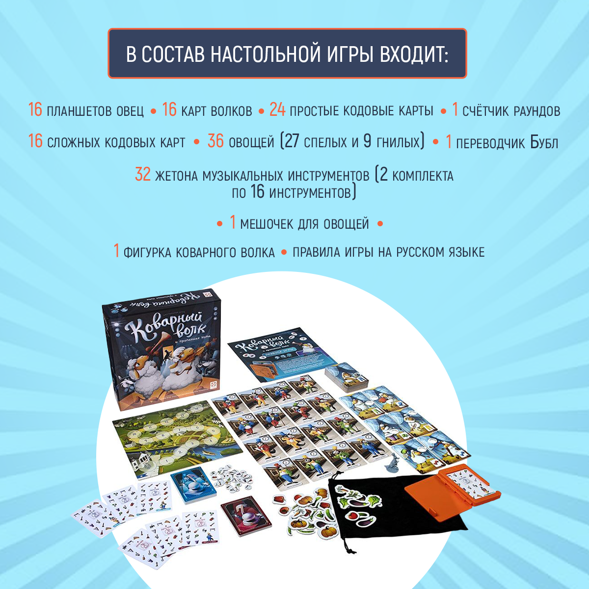 В состав настольной игры Коварный волк и пропавшая нота входят: 16 планшетов овец; 16 карт волков; 24 простые кодовые карты; 16 сложных кодовых карт; 32 жетона музыкальных инструментов (2 комплекта по 16 инструментов); 36 овощей (27 спелых и 9 гнилых); 1 мешочек для овощей; 1 переводчик Бубл; 1 счётчик раундов; 1 фигурка коварного волка; правила игры на русском языке.