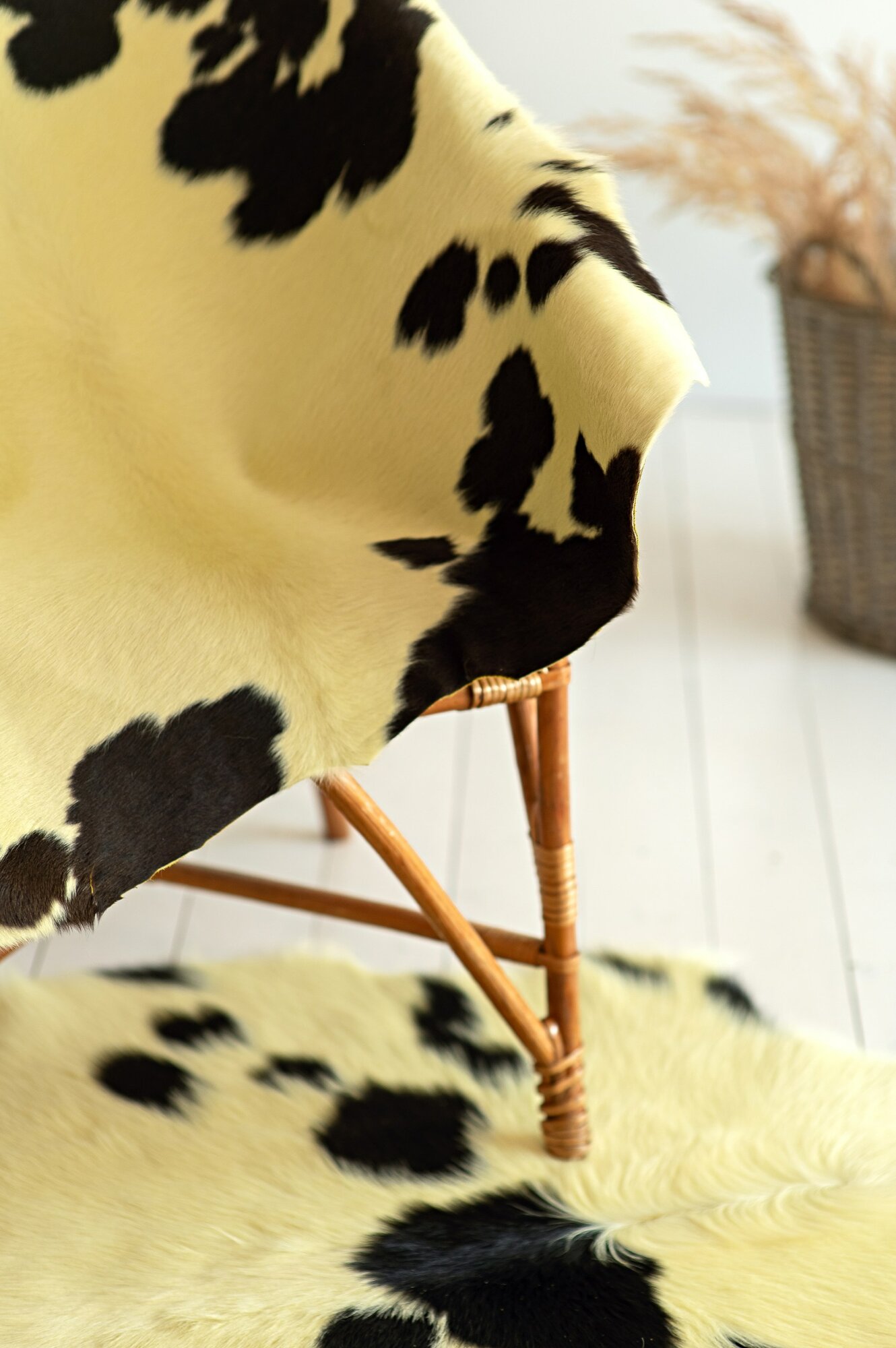 Коровья шкура – модный тренд и любимица дизайнеров интерьеров. У шкуры нет подшерстка, а значит она гипоаллергенна и не собирает пыль. Это прочный материал, благодаря пластичности волоса и особенностям выделки, способна прослужить владельцам до 10 лет. Шкуры настолько приятны на ощупь, что способны снимать напряжение, накопившееся после трудного рабочего дня. Очень широкая сфера применения, начиная от напольного покрытия и заканчивая абажурами. Сегодня такие изделия в тренде. Они легко поддаются чистке. Шкура коровы как ковер отлично украсит и дополнит интерьер, внесет свою изюминку в обстановку. Коровья шкура прекрасно украсит гостиную, кабинет или зал. Шкура плотно ложится на паркет, плитку, ламинат и не скользит. Уюта вашему дому! Этот красивый, стильный аксессуар - прекрасный, необычный подарок для дорогих людей