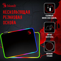 Черный коврик A4Tech Bloody MP-35N имеет устойчивое к износу и выгоранию на солнце тканевое покрытие. Аксессуар сохраняет точность перемещения и отклика мыши на команды. Резиновая подложка не дает коврику скользить по гладкой полировке компьютерного стола. Тщательно прошитые края исключают расслаивание A4Tech Bloody MP-35N и появление закрученных уголков. Размеров 35x25 см хватает для размашистых движений мышкой во время игр и работы за компьютером. Модель с RGB-подсветкой идет в комплекте с USB-кабелем в износостойкой и гибкой тканевой оплетке.