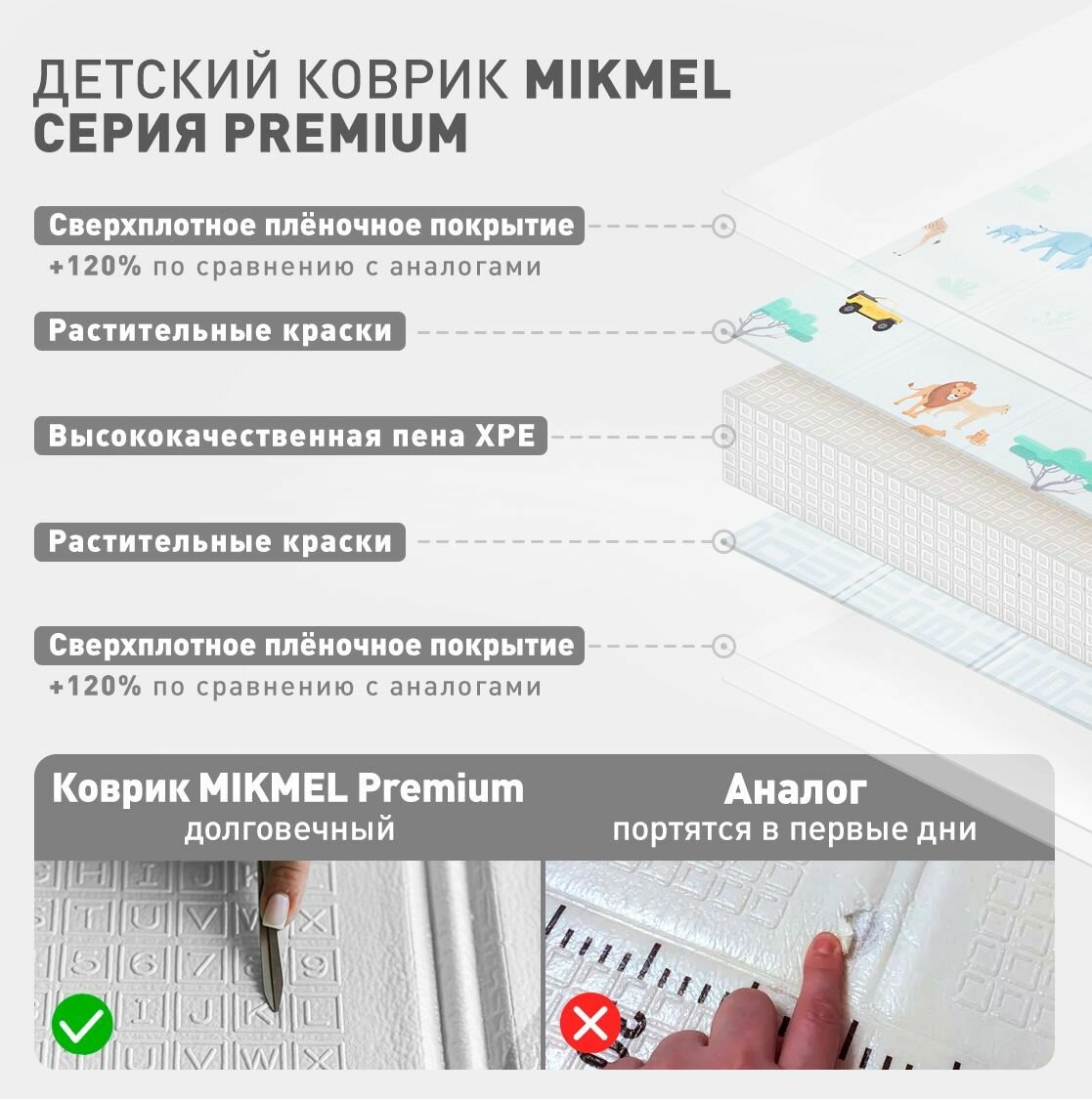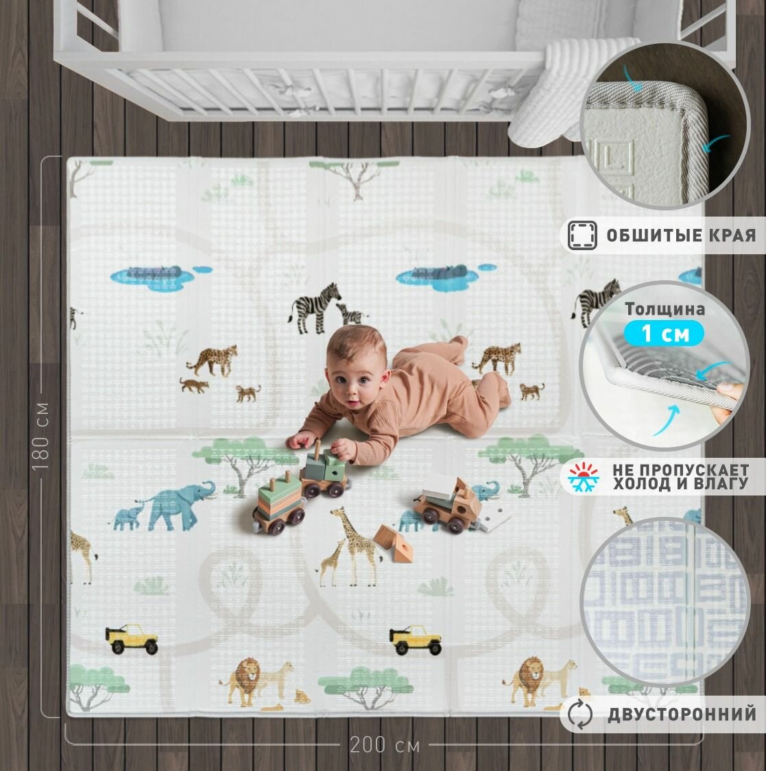 Коврик детский для ползания 180х200х1 см MIKMEL серия Premium создаст просторное и комфортное место для игр и отдыха вашего ребенка. Он позволяет малышу переворачиваться, учиться ползать и делать первые шаги. На коврике имеется рельеф, который развивает мелкую моторику, оказывает массажный эффект и стимулирует правильно развитие стоп ребенка. Его можно использовать как детский ортопедический коврик. За счет интересных дизайнов и возможности рисовать на нем не острыми фломастерами коврик детский развивающий позволяет ребенку открывать творческие способности. Протрите влажной тряпкой шедевр вашего художника, и он снова чист. Коврик в детскую комнату помогает вашему малышу в изучении и развитии тактильного и зрительного восприятия, формировании цветового восприятия, логического мышления и координации движений. Заметный рельеф и интересные картинки помогут вашему ребенку изучить цвета, буквы, цифры, геометрические фигуры и животных. Детский коврик для ползания 180х200 см является износостойким, плотным и упругим, долго сохраняет свою форму. Мы используем более толстое верхнее покрытие по сравнению с конкурентами, для того чтобы коврик был максимально долговечным. Детский развивающий коврик имеет две поверхности с разными дизайнами, одна из которых привлекает ребенка и создает интерактивное пространство для игр, а вторая позволяет вписать коврик в любом современный интерьер. На детский игровой коврик можно поместить игрушки и товары для новорожденных, детские игрушки для мальчика, детские игрушки для девочек, товары для новорожденных с 0+, бизиборд. Все это позволит создать комфортное и интересное место в вашем доме. Коврик детский складной обладает шумоизоляцией и поглощает шум от прыжков. Коврик для ползания детский имеет противоскользящее покрытие, которое защищает малыша от скольжения, препятствует падениям, травмам, амортизирует удары. Коврик защищает нежную кожу ребенка от повреждений и сохраняет колени, кисти рук от холода и потертостей. Коврик детский для ползания складной прекрасно защищает от холода, поскольку имеет высокие термоизоляционные свойства, что делает коврик очень теплым. Его можно использовать с очень холодным полом, на любой поверхности. Термоковрик детский предназначен как для игр в одежде, так и для ползания голышом и ходьбе босиком, он обеспечит тепло и безопасность вашему ребенку, а мягкая текстура сделает пребывание на нем максимально комфортным. Легкий уход за счет водоотталкивающего эффекта, позволяет легко вымыть ковер влажной тряпкой. Коврик детский для ползания складной изготовлен из вспененного пищевого полиэтилена, не имеет запаха, гипоаллергенный, экологически безопасен, не содержит бисфенол А (BPA free). Все это подтверждено обязательной сертификации соответствия ЕАС для детей 0+ месяцев. Складной коврик детский гораздо удобнее чем детский коврик пазл, поскольку его можно легко складывать книжкой и также быстро раскладывать. Размер в сложенном виде составляет 90х40х11 см, в разложенном 180х200х1 см. (±3%). В отличие от коврик пазл детский для ползания, коврик детский складной можно брать с собой. Для комфортного хранения дома среди детских вещей и для поездок в комплекте имеется качественная дорожная сумка. Коврик складной детский подходит для гостиной, детской, в прихожую. Он прекрасно заме