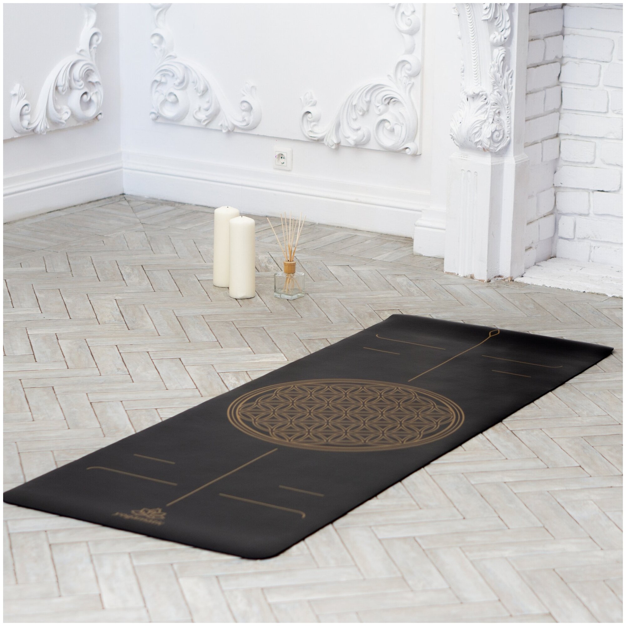 Стильный черный дизайнерский йогамат с золотым рисунком Цветка Жизни на однотонном фоне не только повысит вашу мотивацию, но и станет прекрасным дополнением вашего интерьера. Практикующие медитируют на этом символе, чтобы открыть потенциал своего духовного зрения и углубить свои познания о себе и окружающем мире. C заботой о вас мы соединили комфорт, качество и эстетику, чтобы создать идеальное сочетание для ваших практик. Практикуйте вместе с Йогаматик!