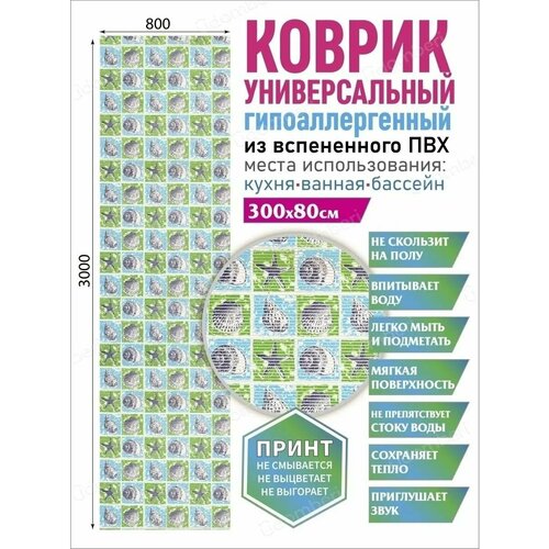 Коврик для ванны или душа в эстетичном дизайне - стильный интерьерный элемент, который станет эффектным украшением комнаты. Универсальный аксессуар толщиной 3 мм выполнен в оптимальном размере: длина - 300 см, ширина - 80 см, изготовлен из гипоаллергенного материала - вспененного ПВХ. Перфорированный «половик» прямоугольной формы украшен стильным принтом, который не смывается, не выцветает и не выгорает, долго радует вас насыщенностью цвета и яркостью декоративного рисунка в виде ракушек или камушков, цветов и растений, красивых узоров. Износостойкий ковер можно расположить в ванной комнате, чтобы опускать на него ноги после купания без риска поскользнуться и упасть. Его можно положить около стиральной машины, около унитаза в туалете. Модный аксессуар уютно украсит совмещенный санузел в доме или квартире. Красивый коврик с очень мягкой поверхностью не скользит по полу, впитывает воду, не препятствует ее активному стоку, приглушает звуки и сохраняет тепло. Современную модель с антискользящей основой выбирают для сауны или бани на даче, для расположения у лесенки бассейна или в душе для водных процедур. Защитный аксессуар важен для вашей безопасности - он исключает опасность поскользнуться на мокрой и скользкой плитке. Гибкий коврик легко скручивается в рулон для хранения и не занимает много места в шкафу. Он прост в уходе: его можно мыть в воде с мыльным раствором вручную, выбирать для очищения стирку в машинке - автомат. Противоскользящий коврик - практичное приобретение для взрослых женщин и мужчин, хороший подарок для родных и близких, для друзей с детьми на новоселье, любой другой праздник, в том числе на день рождения. В линейке бренда представлены модели в сочетаниях светлых и темных цветов, с различными рисунками, в том числе в морском стиле. Долговечную «дорожку» выбирают в виде домашнего или дачного комнатного аксессуара, используют в любое время года: в летний или зимний, осенний или весенний период, в помещении или на улице. Комплект поставки включает один предмет: влаговпитывающий коврик (1 штука). Товар поставляется в защитной упаковке для сохранности изделия в процессе доставки покупателю из нашего магазина. Произведено в России.