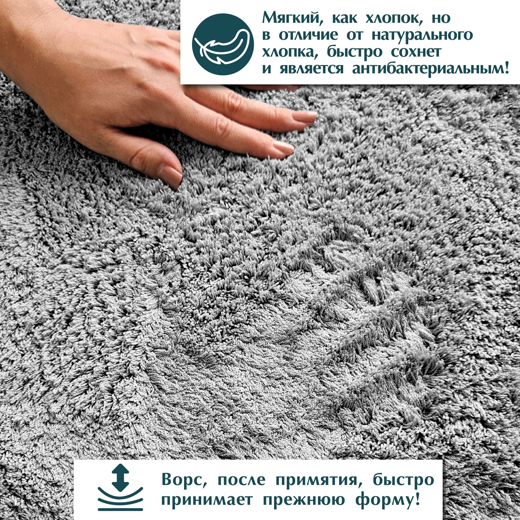 Ворс изделия быстросохнущий и обладает способностью впитывать влагу. Он не способствует размножению бактерий и неприятных запахов.