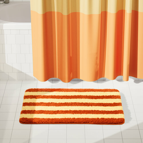 Оранжевый коврик в полоску Pragma Nipsop с пушистым ворсом из микрофибры станет ярким акцентом в интерьере ванной комнаты.