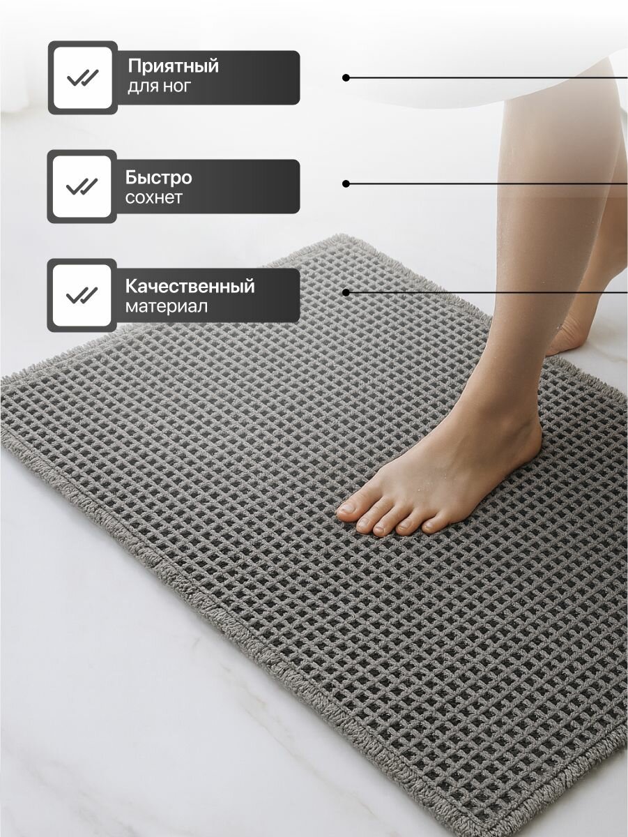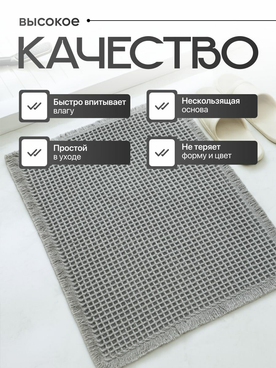 Обновите интерьер и добавьте уюта с помощью практичного и стильного аксессуара. Делая выбор в пользу нашего коврика для ванной в сером цвете и размером 50х80 см, вы получите не только привлекательный внешний вид, но и надежную защиту от влаги и скольжения. Его нейтральный цвет и вафельный дизайн легко впишутся в любой стиль, добавляя аккуратности пространству.