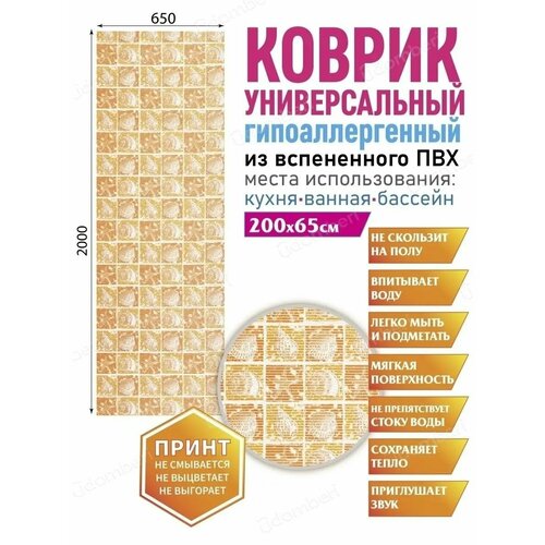 Коврик для ванны или душа в эстетичном дизайне - стильный интерьерный элемент, который станет эффектным украшением комнаты. Универсальный аксессуар толщиной 3 мм выполнен в оптимальном размере: длина - 200 см, ширина - 65 см, изготовлен из гипоаллергенного материала - вспененного ПВХ. Перфорированный «половик» прямоугольной формы украшен стильным принтом, который не смывается, не выцветает и не выгорает, долго радует вас насыщенностью цвета и яркостью декоративного рисунка в виде ракушек или камушков, цветов и растений, красивых узоров. Износостойкий ковер можно расположить в ванной комнате, чтобы опускать на него ноги после купания без риска поскользнуться и упасть. Его можно положить около стиральной машины, около унитаза в туалете. Модный аксессуар уютно украсит совмещенный санузел в доме или квартире. Красивый коврик с очень мягкой поверхностью не скользит по полу, впитывает воду, не препятствует ее активному стоку, приглушает звуки и сохраняет тепло. Современную модель с антискользящей основой выбирают для сауны или бани на даче, для расположения у лесенки бассейна или в душе для водных процедур. Защитный аксессуар важен для вашей безопасности - он исключает опасность поскользнуться на мокрой и скользкой плитке. Гибкий коврик легко скручивается в рулон для хранения и не занимает много места в шкафу. Он прост в уходе: его можно мыть в воде с мыльным раствором вручную, выбирать для очищения стирку в машинке - автомат. Противоскользящий коврик - практичное приобретение для взрослых женщин и мужчин, хороший подарок для родных и близких, для друзей с детьми на новоселье, любой другой праздник, в том числе на день рождения. В линейке бренда представлены модели в сочетаниях светлых и темных цветов, с различными рисунками, в том числе в морском стиле. Долговечную «дорожку» выбирают в виде домашнего или дачного комнатного аксессуара, используют в любое время года: в летний или зимний, осенний или весенний период, в помещении или на улице. Комплект поставки включает один предмет: влаговпитывающий коврик (1 штука). Товар поставляется в защитной упаковке для сохранности изделия в процессе доставки покупателю из нашего магазина. Произведено в России.