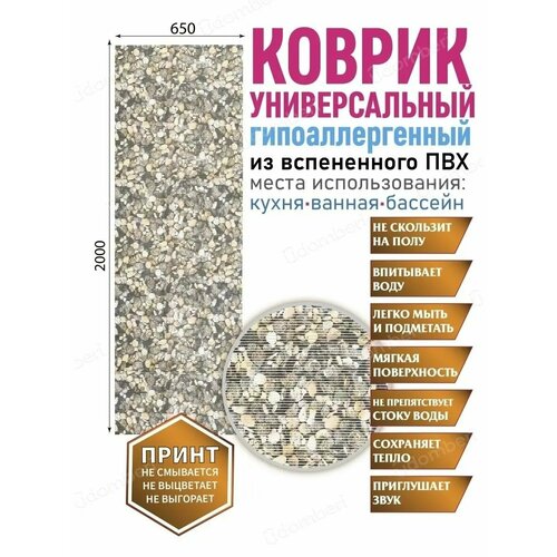Коврик для ванны или душа в эстетичном дизайне - стильный интерьерный элемент, который станет эффектным украшением комнаты. Универсальный аксессуар толщиной 3 мм выполнен в оптимальном размере: длина - 200 см, ширина - 65 см, изготовлен из гипоаллергенного материала - вспененного ПВХ. Перфорированный «половик» прямоугольной формы украшен стильным принтом, который не смывается, не выцветает и не выгорает, долго радует вас насыщенностью цвета и яркостью декоративного рисунка в виде ракушек или камушков, цветов и растений, красивых узоров. Износостойкий ковер можно расположить в ванной комнате, чтобы опускать на него ноги после купания без риска поскользнуться и упасть. Его можно положить около стиральной машины, около унитаза в туалете. Модный аксессуар уютно украсит совмещенный санузел в доме или квартире. Красивый коврик с очень мягкой поверхностью не скользит по полу, впитывает воду, не препятствует ее активному стоку, приглушает звуки и сохраняет тепло. Современную модель с антискользящей основой выбирают для сауны или бани на даче, для расположения у лесенки бассейна или в душе для водных процедур. Защитный аксессуар важен для вашей безопасности - он исключает опасность поскользнуться на мокрой и скользкой плитке. Гибкий коврик легко скручивается в рулон для хранения и не занимает много места в шкафу. Он прост в уходе: его можно мыть в воде с мыльным раствором вручную, выбирать для очищения стирку в машинке - автомат. Противоскользящий коврик - практичное приобретение для взрослых женщин и мужчин, хороший подарок для родных и близких, для друзей с детьми на новоселье, любой другой праздник, в том числе на день рождения. В линейке бренда представлены модели в сочетаниях светлых и темных цветов, с различными рисунками, в том числе в морском стиле. Долговечную «дорожку» выбирают в виде домашнего или дачного комнатного аксессуара, используют в любое время года: в летний или зимний, осенний или весенний период, в помещении или на улице. Комплект поставки включает один предмет: влаговпитывающий коврик (1 штука). Товар поставляется в защитной упаковке для сохранности изделия в процессе доставки покупателю из нашего магазина. Произведено в России.