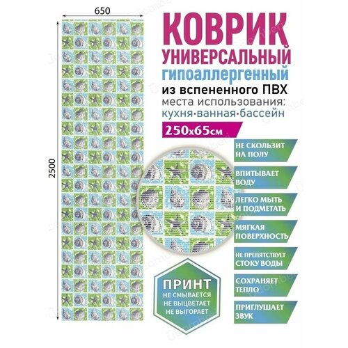 Коврик для ванны или душа в эстетичном дизайне - стильный интерьерный элемент, который станет эффектным украшением комнаты. Универсальный аксессуар толщиной 3 мм выполнен в оптимальном размере: длина - 250 см, ширина - 65 см, изготовлен из гипоаллергенного материала - вспененного ПВХ. Перфорированный «половик» прямоугольной формы украшен стильным принтом, который не смывается, не выцветает и не выгорает, долго радует вас насыщенностью цвета и яркостью декоративного рисунка в виде ракушек или камушков, цветов и растений, красивых узоров. Износостойкий ковер можно расположить в ванной комнате, чтобы опускать на него ноги после купания без риска поскользнуться и упасть. Его можно положить около стиральной машины, около унитаза в туалете. Модный аксессуар уютно украсит совмещенный санузел в доме или квартире. Красивый коврик с очень мягкой поверхностью не скользит по полу, впитывает воду, не препятствует ее активному стоку, приглушает звуки и сохраняет тепло. Современную модель с антискользящей основой выбирают для сауны или бани на даче, для расположения у лесенки бассейна или в душе для водных процедур. Защитный аксессуар важен для вашей безопасности - он исключает опасность поскользнуться на мокрой и скользкой плитке. Гибкий коврик легко скручивается в рулон для хранения и не занимает много места в шкафу. Он прост в уходе: его можно мыть в воде с мыльным раствором вручную, выбирать для очищения стирку в машинке - автомат. Противоскользящий коврик - практичное приобретение для взрослых женщин и мужчин, хороший подарок для родных и близких, для друзей с детьми на новоселье, любой другой праздник, в том числе на день рождения. В линейке бренда представлены модели в сочетаниях светлых и темных цветов, с различными рисунками, в том числе в морском стиле. Долговечную «дорожку» выбирают в виде домашнего или дачного комнатного аксессуара, используют в любое время года: в летний или зимний, осенний или весенний период, в помещении или на улице. Комплект поставки включает один предмет: влаговпитывающий коврик (1 штука). Товар поставляется в защитной упаковке для сохранности изделия в процессе доставки покупателю из нашего магазина. Произведено в России.