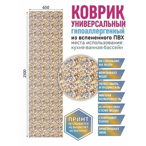 Коврик для ванны или душа в эстетичном дизайне - стильный интерьерный элемент, который станет эффектным украшением комнаты. Универсальный аксессуар толщиной 3 мм выполнен в оптимальном размере: длина - 250 см, ширина - 65 см, изготовлен из гипоаллергенного материала - вспененного ПВХ. Перфорированный «половик» прямоугольной формы украшен стильным принтом, который не смывается, не выцветает и не выгорает, долго радует вас насыщенностью цвета и яркостью декоративного рисунка в виде ракушек или камушков, цветов и растений, красивых узоров. Износостойкий ковер можно расположить в ванной комнате, чтобы опускать на него ноги после купания без риска поскользнуться и упасть. Его можно положить около стиральной машины, около унитаза в туалете. Модный аксессуар уютно украсит совмещенный санузел в доме или квартире. Красивый коврик с очень мягкой поверхностью не скользит по полу, впитывает воду, не препятствует ее активному стоку, приглушает звуки и сохраняет тепло. Современную модель с антискользящей основой выбирают для сауны или бани на даче, для расположения у лесенки бассейна или в душе для водных процедур. Защитный аксессуар важен для вашей безопасности - он исключает опасность поскользнуться на мокрой и скользкой плитке. Гибкий коврик легко скручивается в рулон для хранения и не занимает много места в шкафу. Он прост в уходе: его можно мыть в воде с мыльным раствором вручную, выбирать для очищения стирку в машинке - автомат. Противоскользящий коврик - практичное приобретение для взрослых женщин и мужчин, хороший подарок для родных и близких, для друзей с детьми на новоселье, любой другой праздник, в том числе на день рождения. В линейке бренда представлены модели в сочетаниях светлых и темных цветов, с различными рисунками, в том числе в морском стиле. Долговечную «дорожку» выбирают в виде домашнего или дачного комнатного аксессуара, используют в любое время года: в летний или зимний, осенний или весенний период, в помещении или на улице. Комплект поставки включает один предмет: влаговпитывающий коврик (1 штука). Товар поставляется в защитной упаковке для сохранности изделия в процессе доставки покупателю из нашего магазина. Произведено в России.