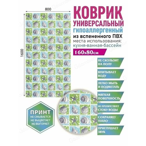 Коврик для ванны или душа в эстетичном дизайне - стильный интерьерный элемент, который станет эффектным украшением комнаты. Универсальный аксессуар толщиной 3 мм выполнен в оптимальном размере: длина - 160 см, ширина - 80 см, изготовлен из гипоаллергенного материала - вспененного ПВХ. Перфорированный «половик» прямоугольной формы украшен стильным принтом, который не смывается, не выцветает и не выгорает, долго радует вас насыщенностью цвета и яркостью декоративного рисунка в виде ракушек или камушков, цветов и растений, красивых узоров. Износостойкий ковер можно расположить в ванной комнате, чтобы опускать на него ноги после купания без риска поскользнуться и упасть. Его можно положить около стиральной машины, около унитаза в туалете. Модный аксессуар уютно украсит совмещенный санузел в доме или квартире. Красивый коврик с очень мягкой поверхностью не скользит по полу, впитывает воду, не препятствует ее активному стоку, приглушает звуки и сохраняет тепло. Современную модель с антискользящей основой выбирают для сауны или бани на даче, для расположения у лесенки бассейна или в душе для водных процедур. Защитный аксессуар важен для вашей безопасности - он исключает опасность поскользнуться на мокрой и скользкой плитке. Гибкий коврик легко скручивается в рулон для хранения и не занимает много места в шкафу. Он прост в уходе: его можно мыть в воде с мыльным раствором вручную, выбирать для очищения стирку в машинке - автомат. Противоскользящий коврик - практичное приобретение для взрослых женщин и мужчин, хороший подарок для родных и близких, для друзей с детьми на новоселье, любой другой праздник, в том числе на день рождения. В линейке бренда представлены модели в сочетаниях светлых и темных цветов, с различными рисунками, в том числе в морском стиле. Долговечную «дорожку» выбирают в виде домашнего или дачного комнатного аксессуара, используют в любое время года: в летний или зимний, осенний или весенний период, в помещении или на улице. Комплект поставки включает один предмет: влаговпитывающий коврик (1 штука). Товар поставляется в защитной упаковке для сохранности изделия в процессе доставки покупателю из нашего магазина. Произведено в России. У нас есть акции и распродажи, вы можете купить наши товары в подарок со скидкой!