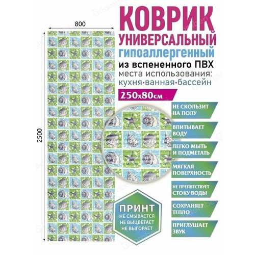 Коврик для ванны или душа в эстетичном дизайне - стильный интерьерный элемент, который станет эффектным украшением комнаты. Универсальный аксессуар толщиной 3 мм выполнен в оптимальном размере: длина - 250 см, ширина - 80 см, изготовлен из гипоаллергенного материала - вспененного ПВХ. Перфорированный «половик» прямоугольной формы украшен стильным принтом, который не смывается, не выцветает и не выгорает, долго радует вас насыщенностью цвета и яркостью декоративного рисунка в виде ракушек или камушков, цветов и растений, красивых узоров. Износостойкий ковер можно расположить в ванной комнате, чтобы опускать на него ноги после купания без риска поскользнуться и упасть. Его можно положить около стиральной машины, около унитаза в туалете. Модный аксессуар уютно украсит совмещенный санузел в доме или квартире. Красивый коврик с очень мягкой поверхностью не скользит по полу, впитывает воду, не препятствует ее активному стоку, приглушает звуки и сохраняет тепло. Современную модель с антискользящей основой выбирают для сауны или бани на даче, для расположения у лесенки бассейна или в душе для водных процедур. Защитный аксессуар важен для вашей безопасности - он исключает опасность поскользнуться на мокрой и скользкой плитке. Гибкий коврик легко скручивается в рулон для хранения и не занимает много места в шкафу. Он прост в уходе: его можно мыть в воде с мыльным раствором вручную, выбирать для очищения стирку в машинке - автомат. Противоскользящий коврик - практичное приобретение для взрослых женщин и мужчин, хороший подарок для родных и близких, для друзей с детьми на новоселье, любой другой праздник, в том числе на день рождения. В линейке бренда представлены модели в сочетаниях светлых и темных цветов, с различными рисунками, в том числе в морском стиле. Долговечную «дорожку» выбирают в виде домашнего или дачного комнатного аксессуара, используют в любое время года: в летний или зимний, осенний или весенний период, в помещении или на улице. Комплект поставки включает один предмет: влаговпитывающий коврик (1 штука). Товар поставляется в защитной упаковке для сохранности изделия в процессе доставки покупателю из нашего магазина. Произведено в России.