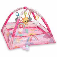 | комплектация | коврик, две игровые дуги с 5 съемными игрушками (3 пластиковые погремушки, безопасное зеркальце и шуршащая с изображениями животных книжечка с пищалкой), 18 пластмассовых шариков, сетка-манеж |