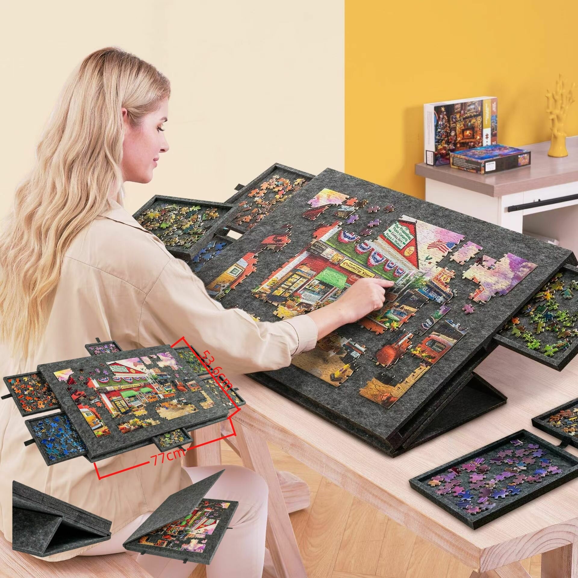 Эта доска для головоломок размером 77 x 53,6 см идеально подходит для игр с пазлами до 1000 деталей. Она может послужить вам хорошим помощником во время игры в пазлы в гостиной, спальне или на природе.