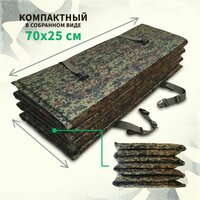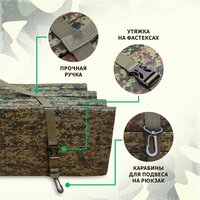 Изготовлен из прочного цельного пенополиэтиленового (пенка) материала с внешним покрытием из максимально надежной и износостойкой синтетической ткани типа Оксфорд 600d расцветки Пиксель (цифра) армейского образца. Толщина утеплителя 2 сантиметра. Утяжка на фастексах. Имеется два карабина для крепления к рюкзаку.