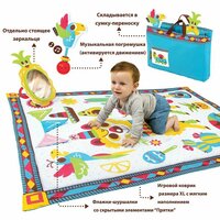 Ваш малыш будет постоянно увлечен, исследуя элементы коврика и яркие рисунки. Если приоткрыть три флажка на коврике, то можно услышать звук шуршащей бумаги и найти спрятанные под флажками рисунки. В игре малыш освоит новые движения - научится переворачиваться, ползать, сидеть. Мягкий набивной коврик выполнен из нетканого текстильного материала приятного на ощупь, края обшиты разноцветной тканью. Разнофактурный материал игрушек (музыкальная погремушка и большое безопасное зеркальце "Ананас") способствует развитию мелкой моторики пальчиков рук, тактильных и зрительных ощущений, двигательных навыков ребенка. Игровой развивающий коврик легко складывается в сумку-переноску для удобства хранения и путешествий. На внешней стороне сумки-переноски размещен кармашек, который можно использовать для важных мелочей.