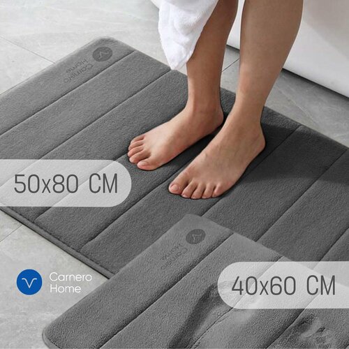 Коврики для ванны и туалета от Carnero - идеальный вариант для создания домашнего уюта и комфорта в ванной комнате. Комплект ковриков для ванной комнаты и туалета состоит из двух ковриков размерами 40х60 и 50х80 см. Коврик невероятно мягкий, так как изделие выполнено из пены с эффектом памяти (Memory foam). Это эластичный полимер. Устойчивый к нагрузкам. Пористая фактура материала реагирует на вес и тепло человека, плавно подстраиваясь под него. После сжатия пена сначала сохраняет форму ноги, а после восстанавливается. Химическая составляющая пены препятствует развитию плесени и микроорганизмов, однако абсолютна безвредна для человеческого организма. Материал покрытия - полиэстер. Прочный материал, который наощупь схож с хлопком. Коврик можно стирать в стиральной машине при низких температурах. Изделие не затирается, а также не теряет форму и свои уникальные свойства после стирки. Набор ковриков для ванной имеет прорезиненный нижний слой. Дополнительно рекомендуем стелить на коврик полотенце для ног, так как для полного высыхания пена памяти требуется хорошо проветриваемое помещение и более длительное время. Коврик для ванной и туалета подходит для полов с подогревом. Допустимое расхождение размеров ковриков: +- 1 см.