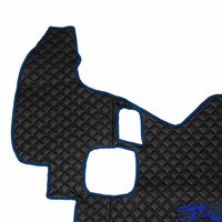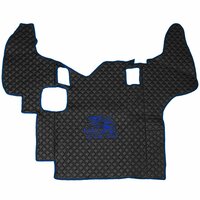 Купить Ковры стеганые для грузовых автомобилей SCANIA 5 серии P (механика), черный цвет с синей вышивкой и синим кантом. Экокожа — 3шт в комплекте (пассажир+водитель+шахта) с доставкой по всей России.
