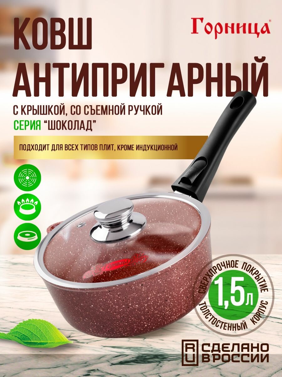 Купить Ковш антипригарный литой 1,5л со съемной ручкой и стеклянной крышкой Шоколад ТМ Горница с доставкой по всей России. Ковш антипригарный литой 1,5л со съемной ручкой и стеклянной крышкой Шоколад ТМ Горница: сравнение цен, характеристики, фото, актуальное наличие и цены.