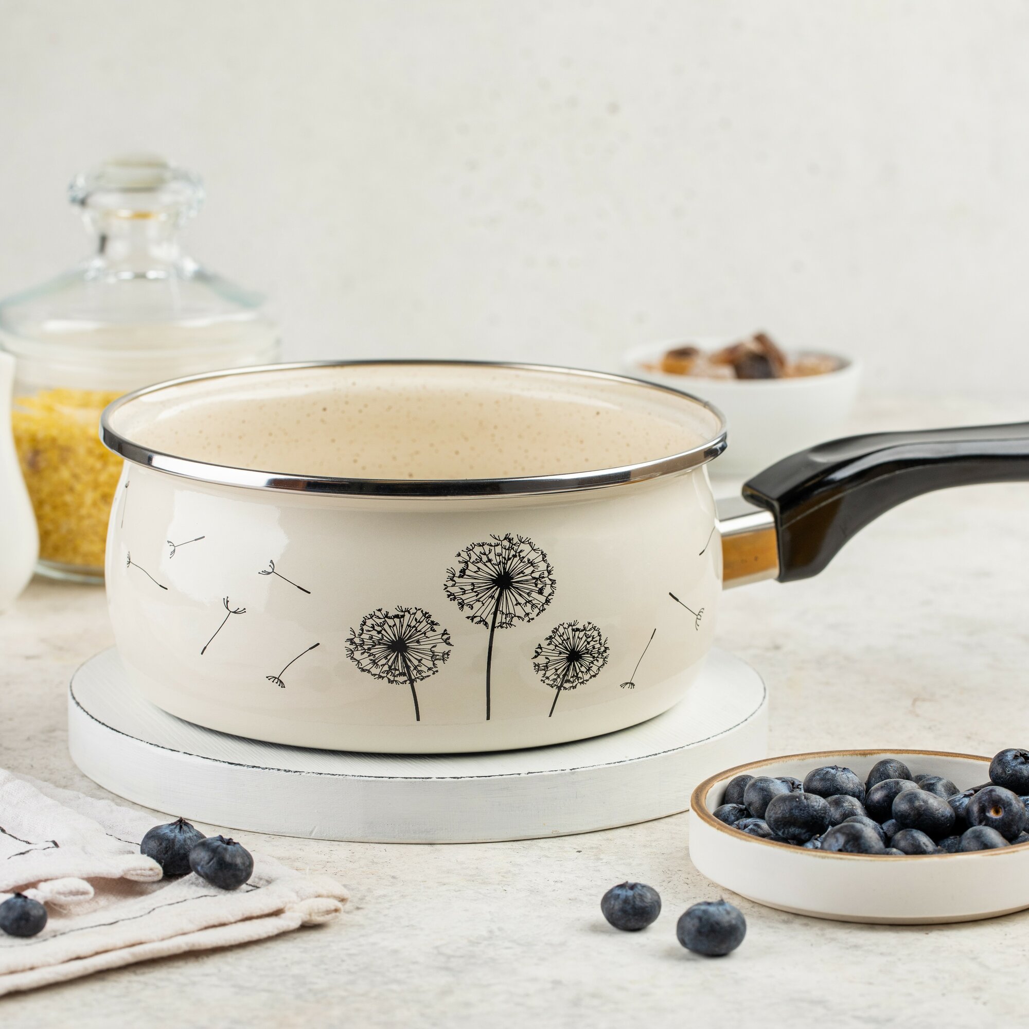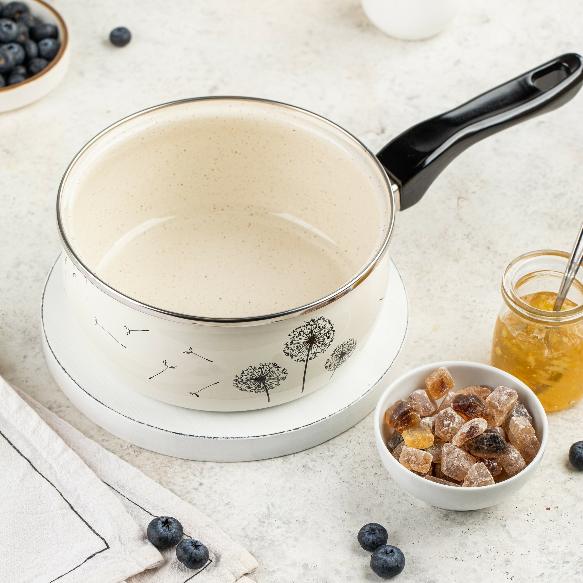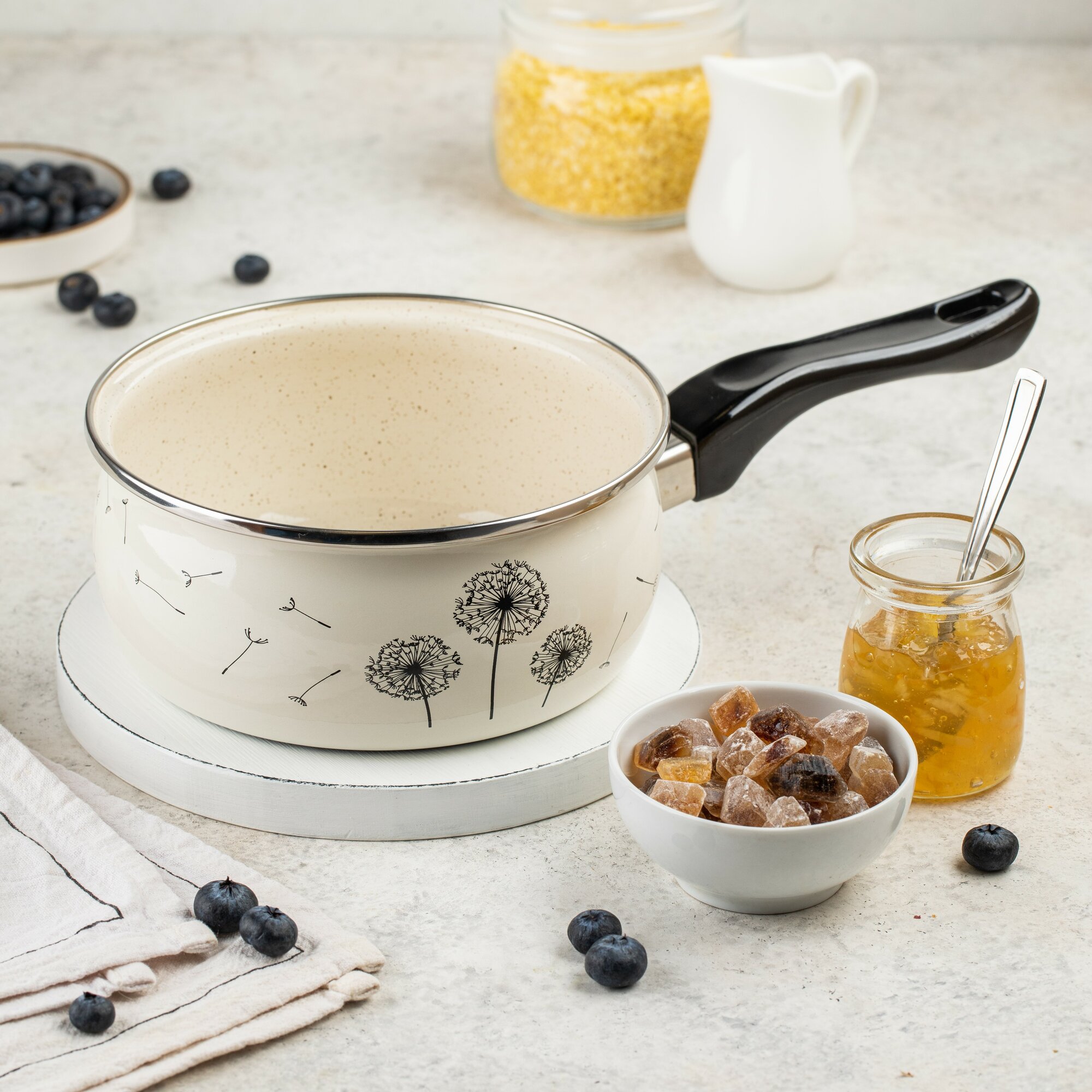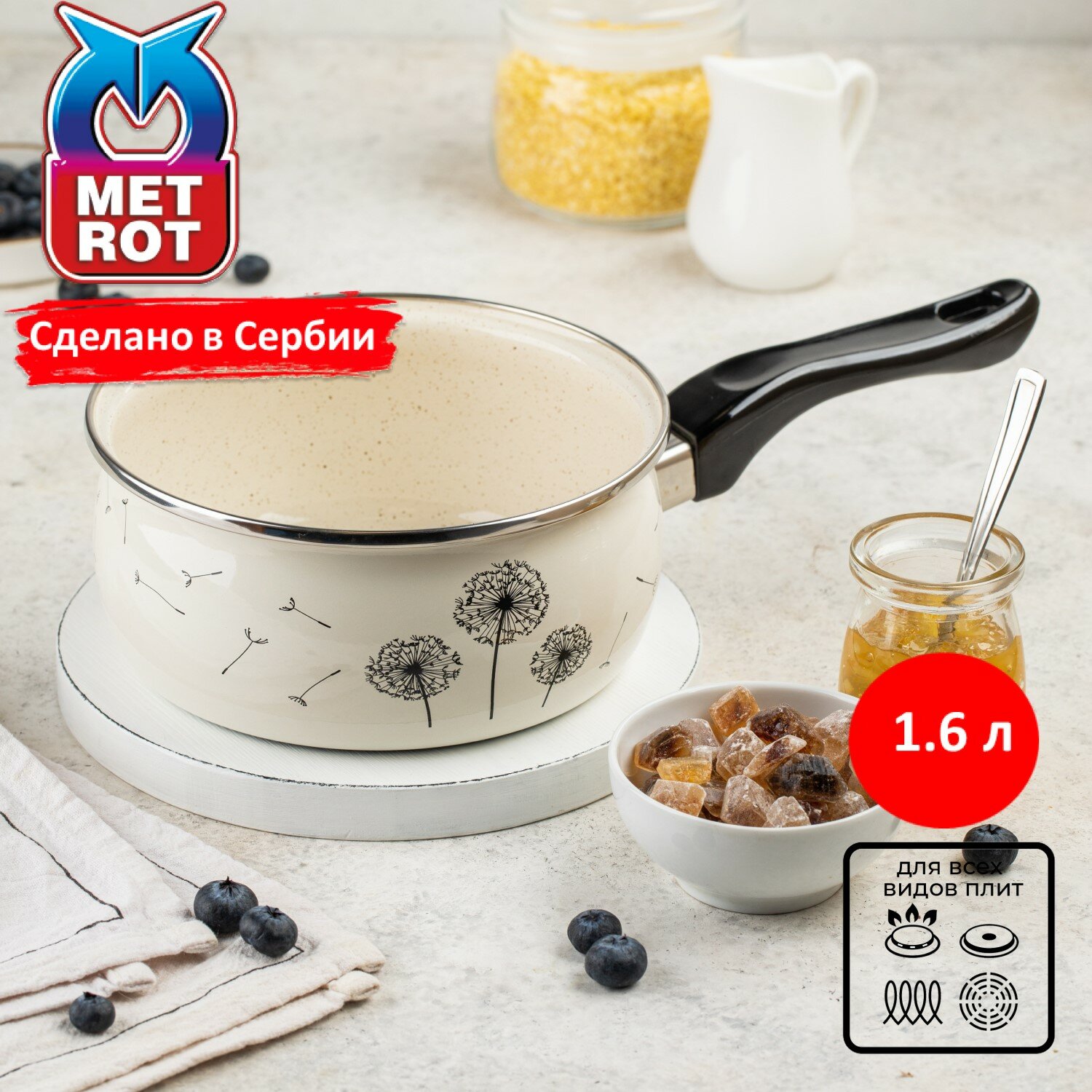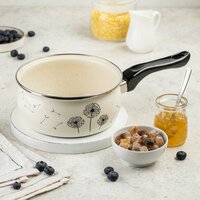 Ковш кухонный Metrot Одуванчик 1,6 л - этот инвентарь является незаменимым помощником на любой кухне, пригодным для приготовления различных блюд. Наш эмалированный ковшик - это идеальный выбор для приготовления разнообразных блюд. Он прекрасно подходит для приготовления питательного молока или отваривания яиц. Благодаря своему оптимальному объему вы легко сможете приготовить вкусную и полезную кашу для всей семьи. Этот качественный стальной ковшик станет не только полезным инструментом на вашей кухне, но и прекрасным подарком для вашей мамы или как подарок на новоселье вашим друзьям. Эмалированная сталь высокого качества обеспечивает долгий срок службы данного помощника при готовке. Ковш легко моется в посудомоечной машине. Кроме того, он оборудован удобной бакелитовой ручкой для безопасного использования. Обладая изысканным дизайном и происходящий из Сербии, этот кухонный ковш притягивает внимание своей элегантностью и функциональностью. Он станет незаменимым аксессуаром на вашей кухне и поможет создать атмосферу комфорта при приготовлении любимых блюд. Наше предложение - это не просто обычный ковш. Это надежное решение для всех задач на вашей кухне. Позвольте этому железному помощнику стать вашим надежным спутником в приготовлении пищи и подарить вам комфорт и удовлетворение на вашей кухне. Потребность в качественной посуде для вашей кухни никогда не устаревает.