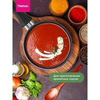 Объем ковша составляет 1,2 литра, что делает его идеальным выбором для разогрева соусов, приготовления каш, супов и других блюд небольшого объема. Эргономичная ручка обеспечивает удобный и безопасный захват, не нагревается и позволяет легко маневрировать ковшом во время приготовления.