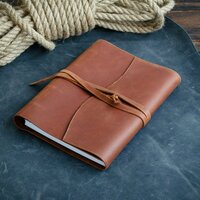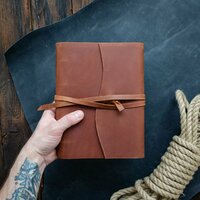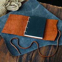Блокнот на кольцах с обложкой из натуральной кожи, формата А5 (15-21см). Закрывается на хлястик, который обматывается вокруг блокнота. Вместе с бумажным блоком в комплекте идут вставки из плотного картона. Они позволяют блокноту лучше держать форму и делать записи даже на весу.