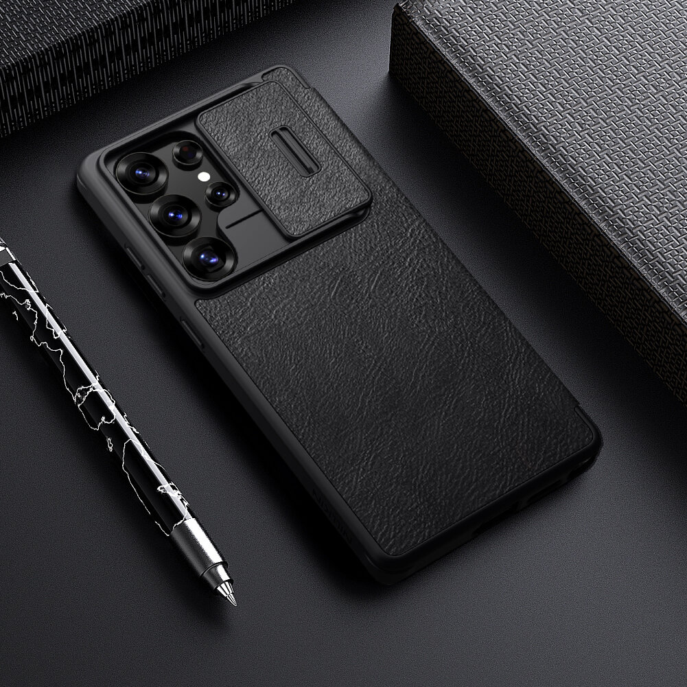 Купить Кожаный чехол книжка черного цвета от Nillkin для Samsung Galaxy S25 Ultra, серия Qin Pro Leather с сдвижной защитной шторкой для камеры с доставкой по всей России.
