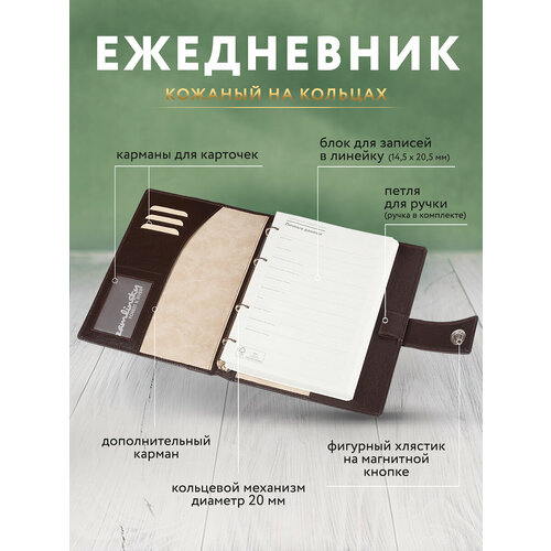 Ежедневник кожаный А5, коричневый, Блок формата 145 х 205 мм, бумага белая или кремовая на выбор. Датированный или недатированный блок на выбор. Обложка с кольцевым механизмом из натуральной кожи "Вита", цвет коричневый. Петля для ручки, карманы для карточек. Закрывается на магнитный хлястик. Для этого ежедневника также доступны сменные блоки.